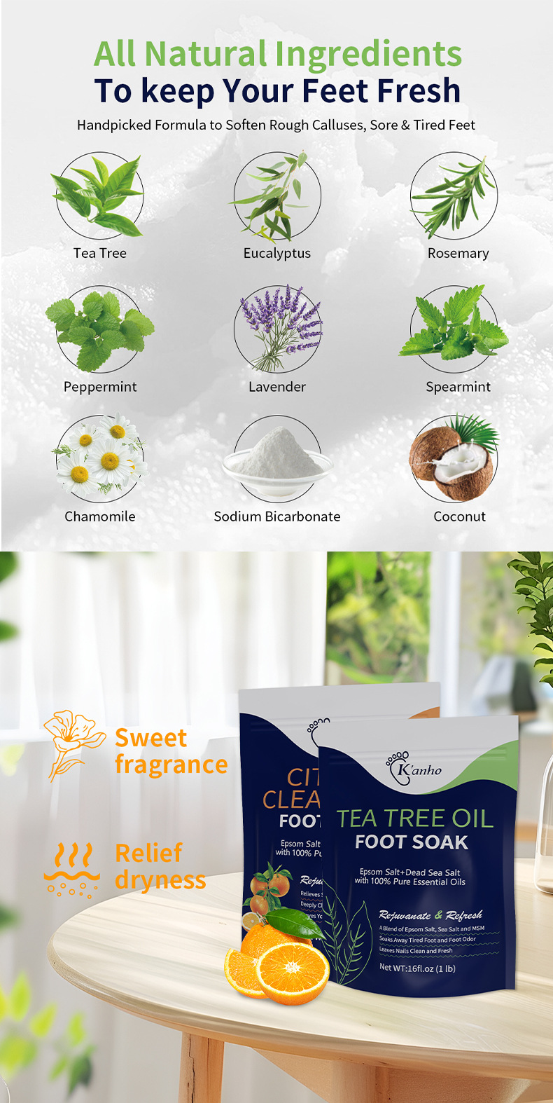 Net content: Tea Tree feet bathing salt 16oz(Tea Tree Oil Foot Soak)(for export only), Lavender feet bathing salt 16oz(Lavender Foot Soak)(for export only), citrus feet bathing salt 16oz(Citrus Foot Soak)(for export only), Muscle relaxation feet bathing salt 16oz(Muscle Relief Foot Soak)(for export only), tea tree mint feet bathing salt 16oz(Tea tree and peppermint foot s (for export only)