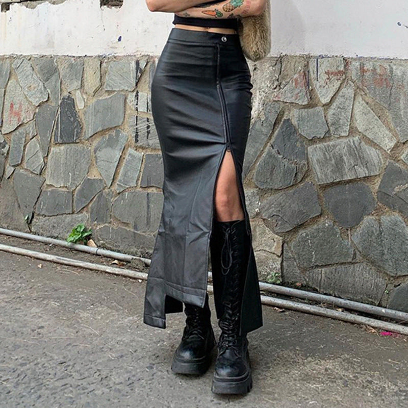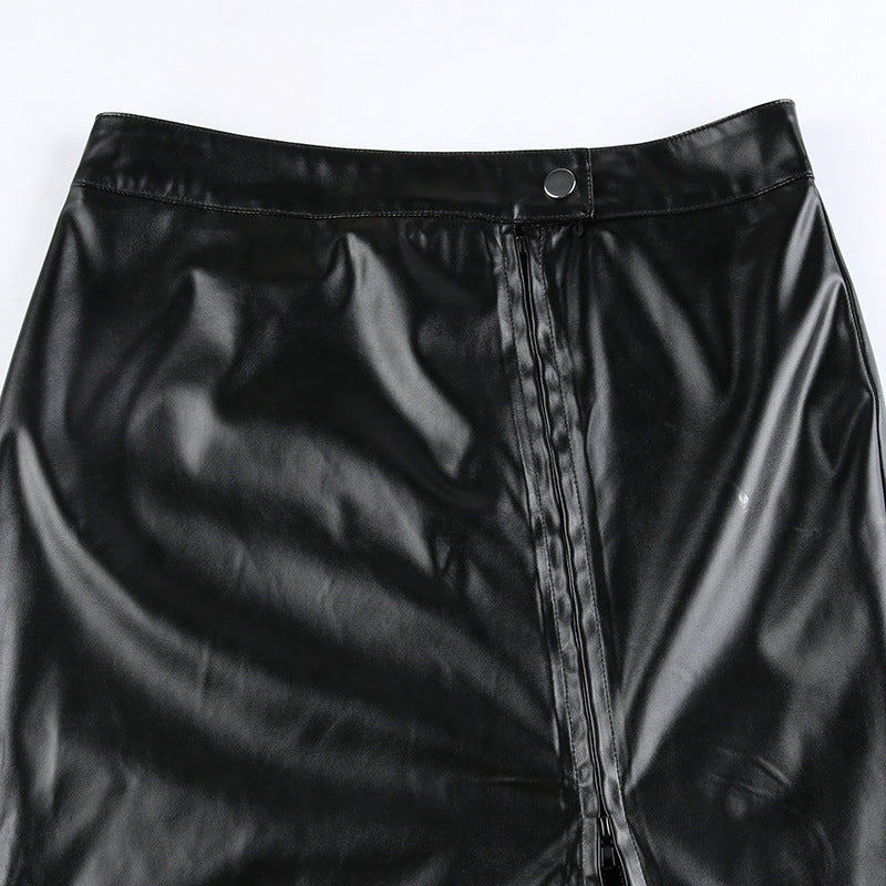Stitching Ruffle Long Leather Skirt