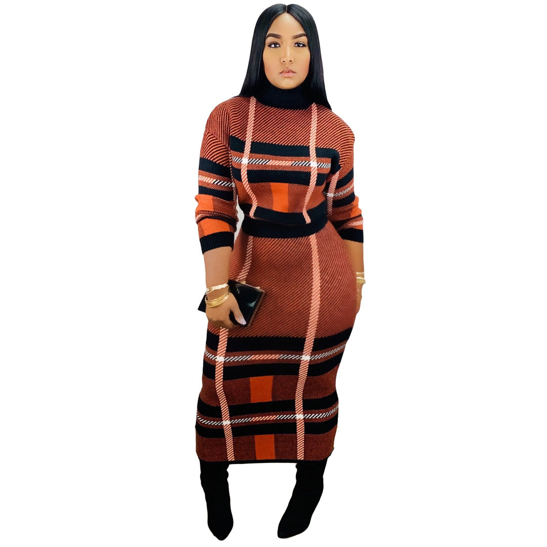 Two-piece Casual Fashion Long-sleeved Piled Collar Printed Long Skirt