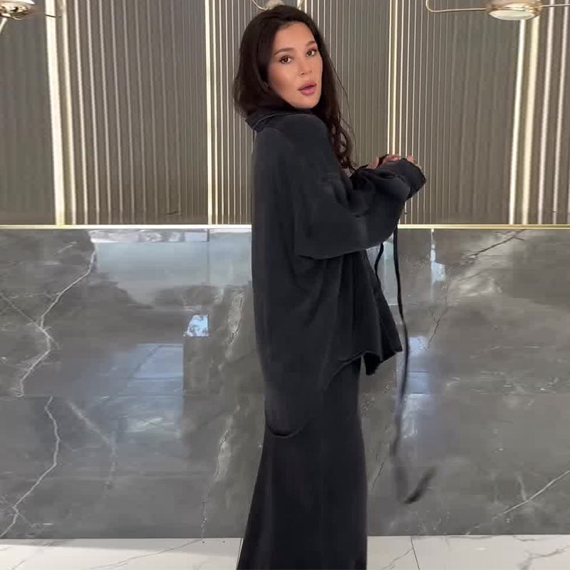 Women's Clothing Belt Waist-controlled Long Sleeves Denim Long Skirts Two-piece Set